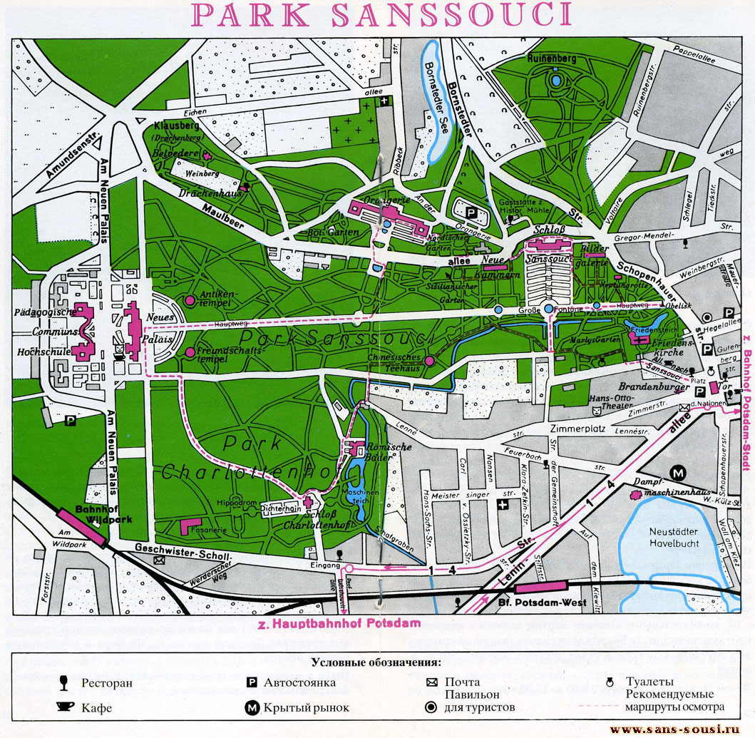 Главной достопримечательностью Потсдама является парк Сан-Суси (Sans Souci – с франц. "без забот") с его знаменитыми дворцами и сооружениями.